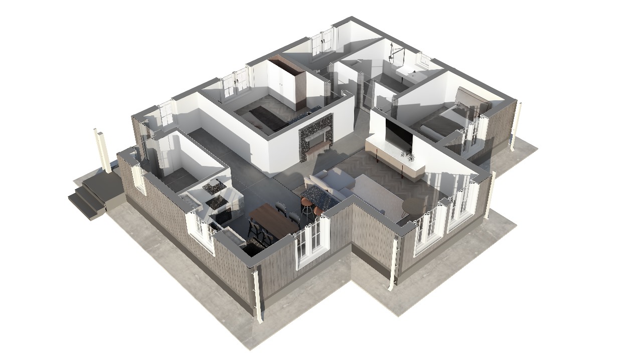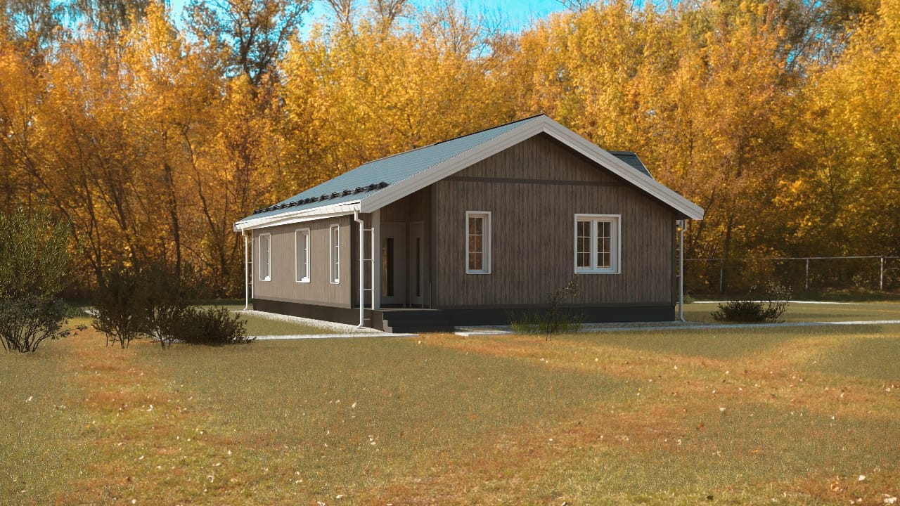 Дом из СИП-панелей, с удобной планировкой: кухня-гостиная, котельная, холл, с/у, 2 спальни, коридор, кладовая, крыльцо. Общая площадь дома: 107,6 м2.