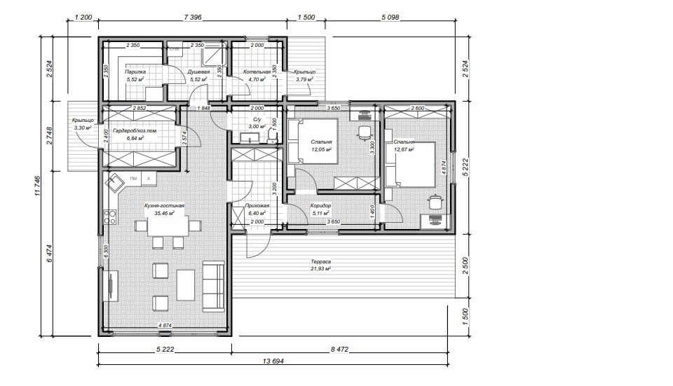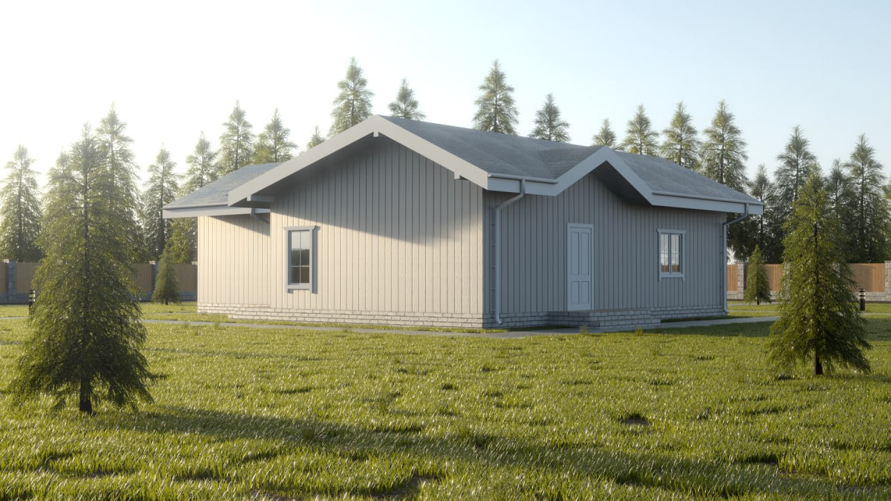 Дом из СИП-панелей, с удобной планировкой: кухня-гостиная, гардероб / хоз. помещение, парилка, душевая, котельная, прихожая, коридор, 2 спальни, с/у, терраса. Общая площадь дома (с террасой и крыльцом): 138,9 м2.