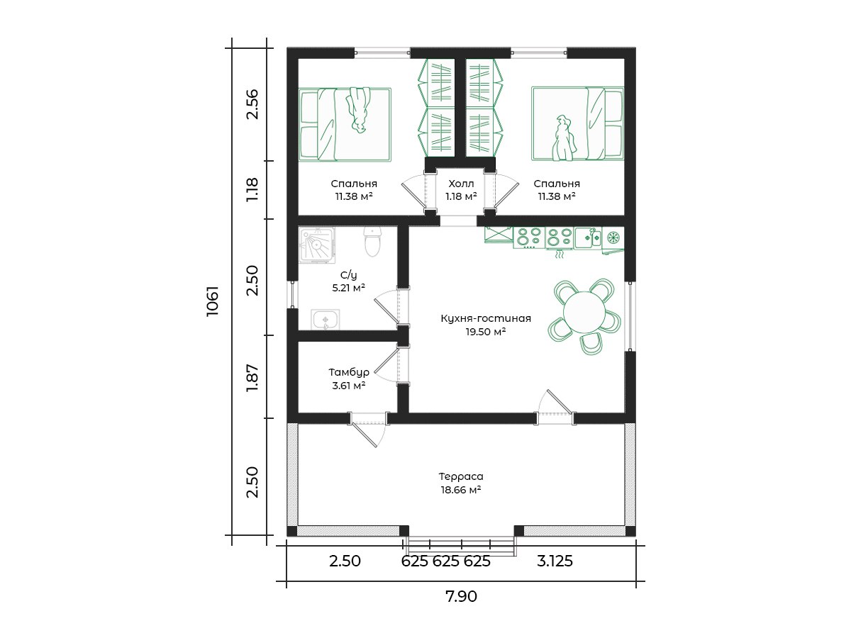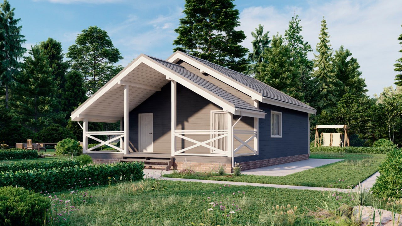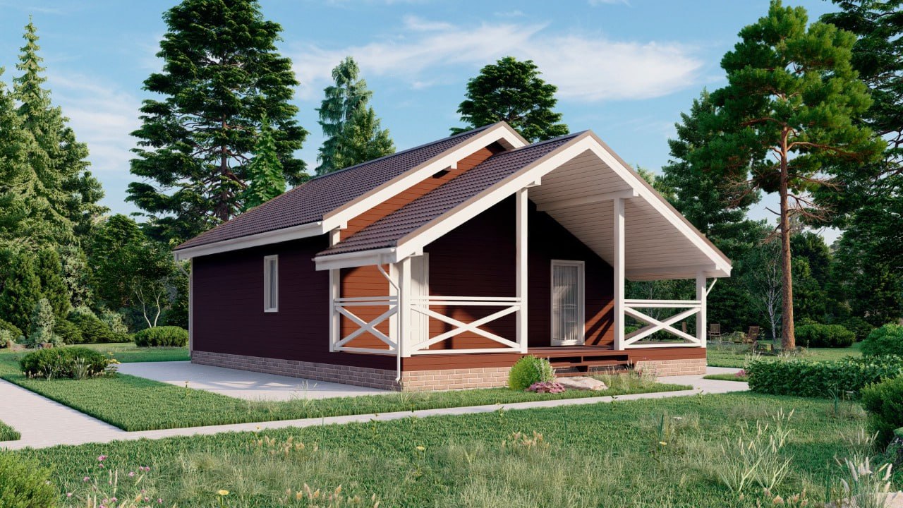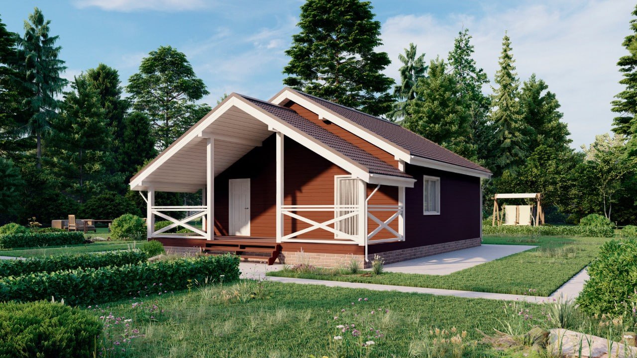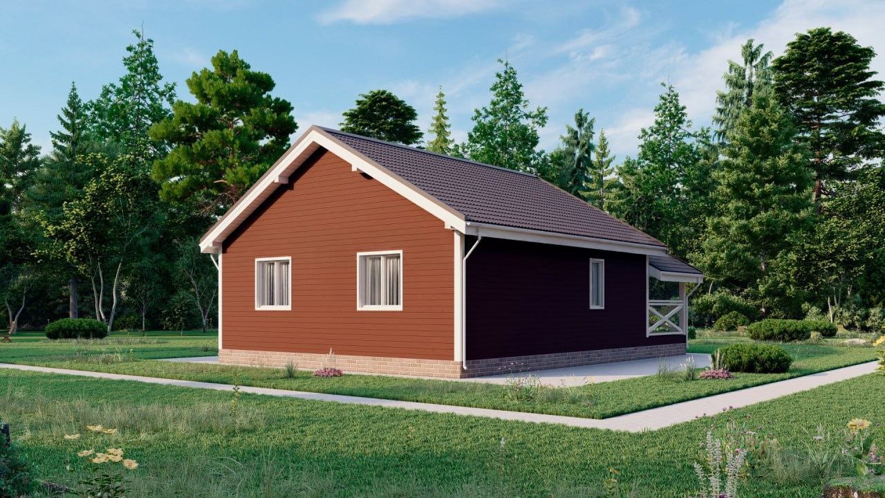 Дом из СИП-панелей, с удобной планировкой: кухня-гостиная, тамбур, холл, 2 спальни, с/у, терраса. Общая площадь дома (с террасой): 83,74 м2.