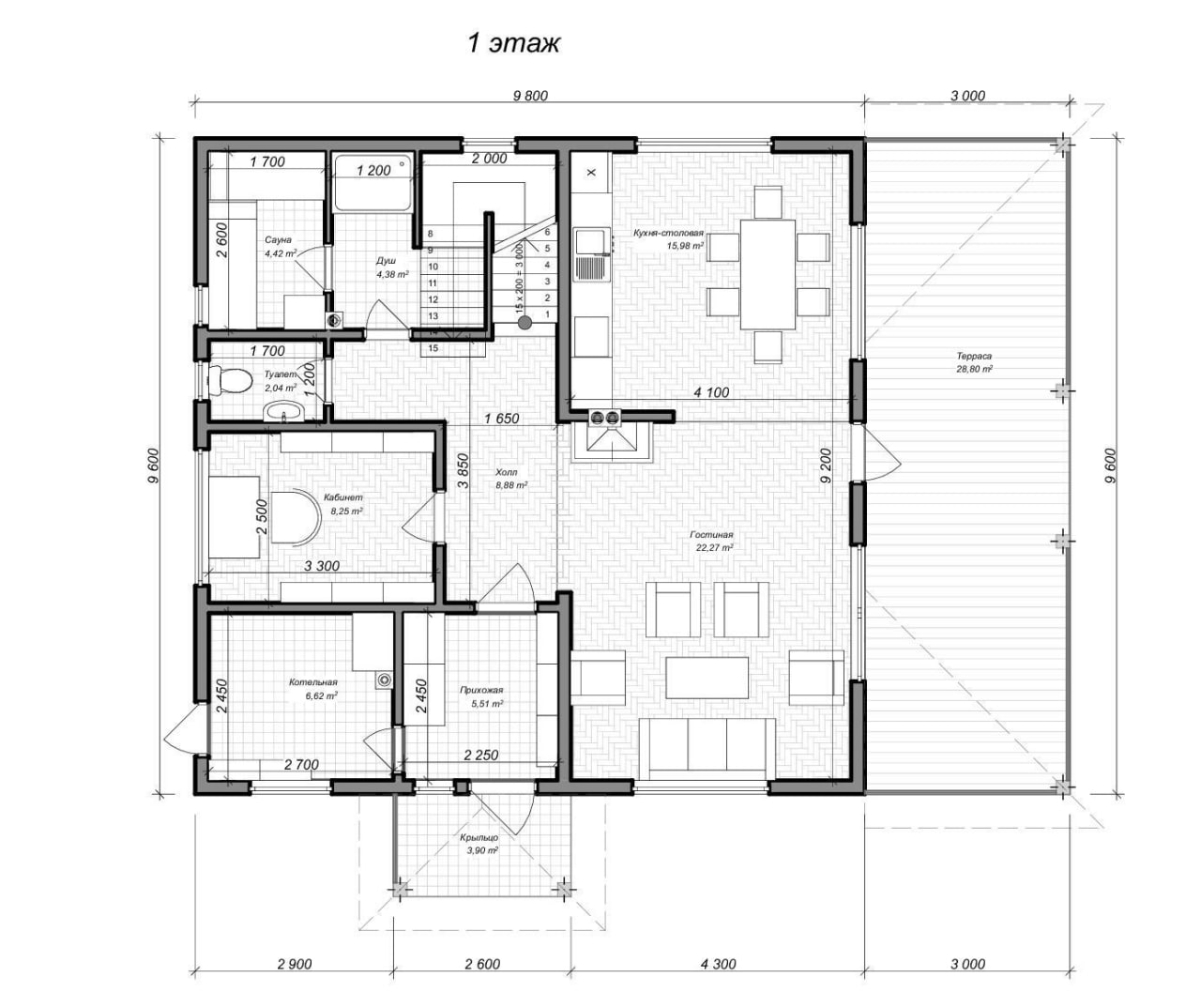 Дом из СИП-панелей, с удобной планировкой: кухня-столовая, терраса, туалет, 2 холла, душ, сауна, с/у, кабинет, котельная, прихожая, гардероб, 3 спальни, лоджия. Общая площадь дома (с террасой и крыльцом): 220,8 м2.