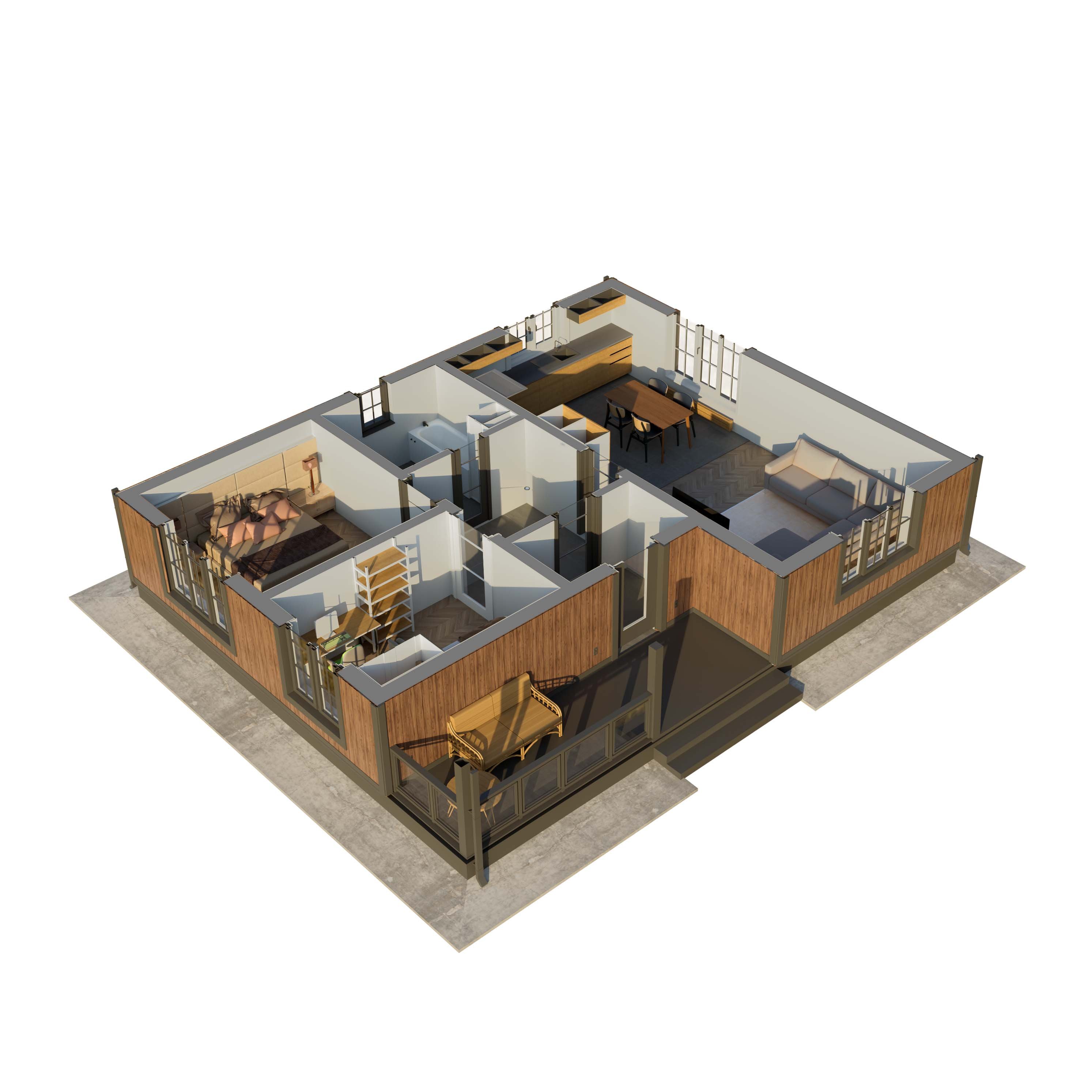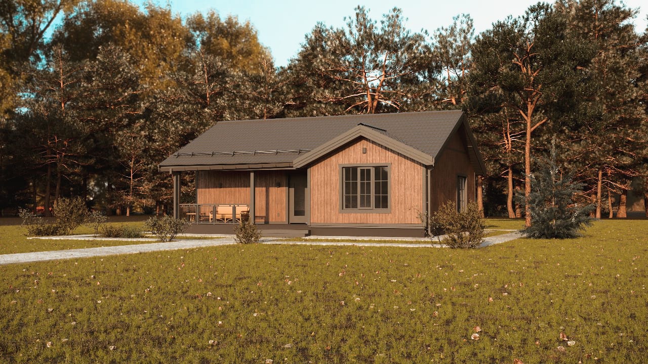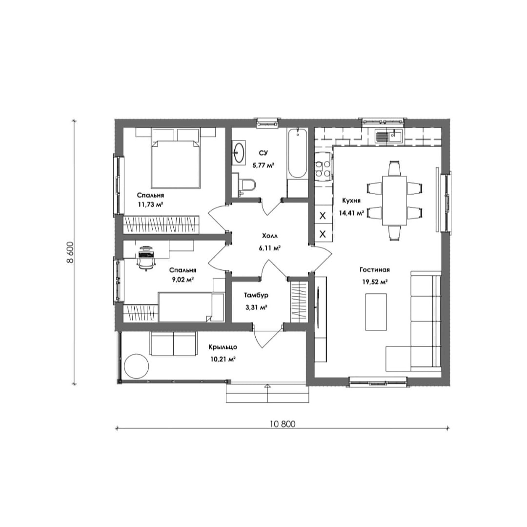Дом из СИП-панелей с удобной планировкой: прихожая, холл, кухня-гостиная, крыльцо, с/у, 2 спальни, тамбур. Общая площадь: 92,88 м2