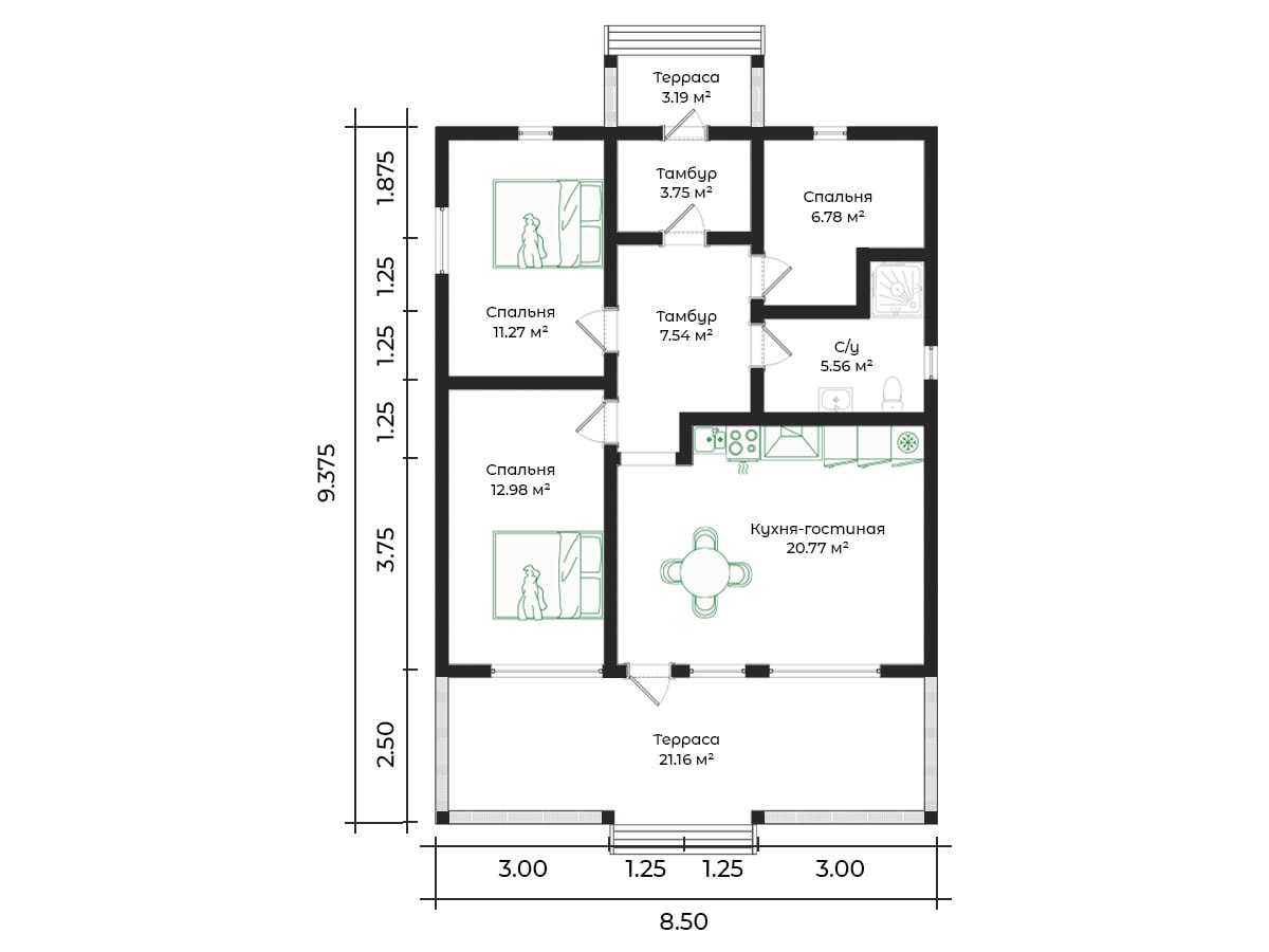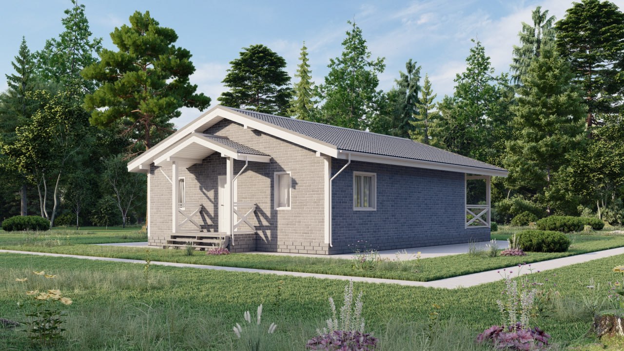 Дом из СИП-панелей, с удобной планировкой: кухня-гостиная, 3 спальни, 2 тамбура, с/у, 2 террасы. Общая площадь дома (с террасой и крыльцом): 82,8 м2.