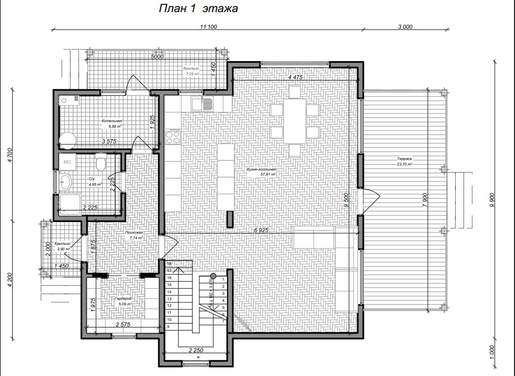 Дом из СИП-панелей, с удобной планировкой: кухня-гостиная, котельная, прихожая, 2 гардероба, 3 спальни, холл, 2 с/у, терраса. Общая площадь дома (с террасой и крыльцом): 241,5 м2.