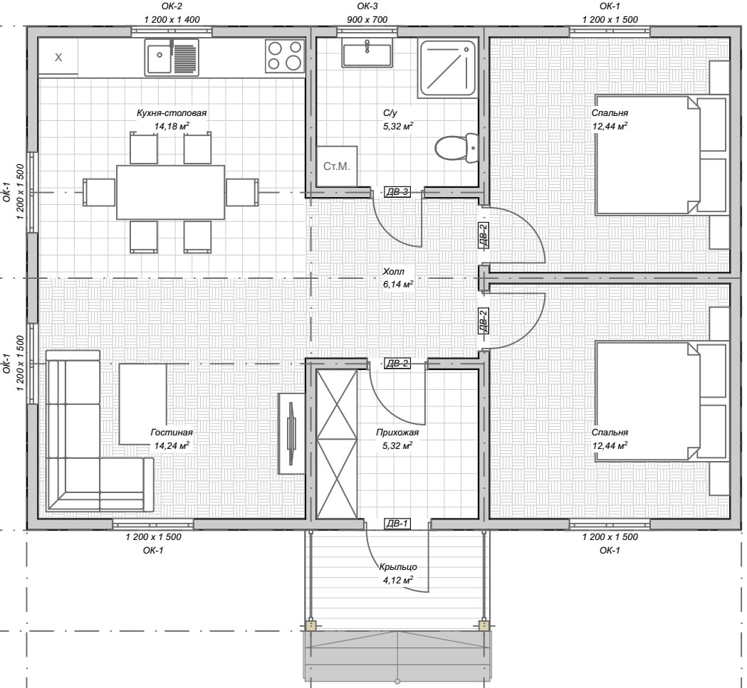 Дом из СИП-панелей с удобной планировкой: прихожая, холл, гостиная, кухня-столовая, с/у, 2 спальни. Общая площадь: 84,2 м2