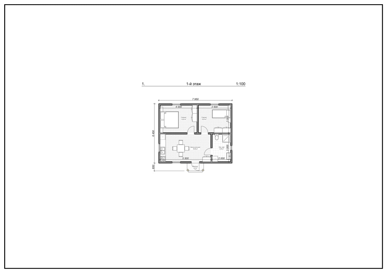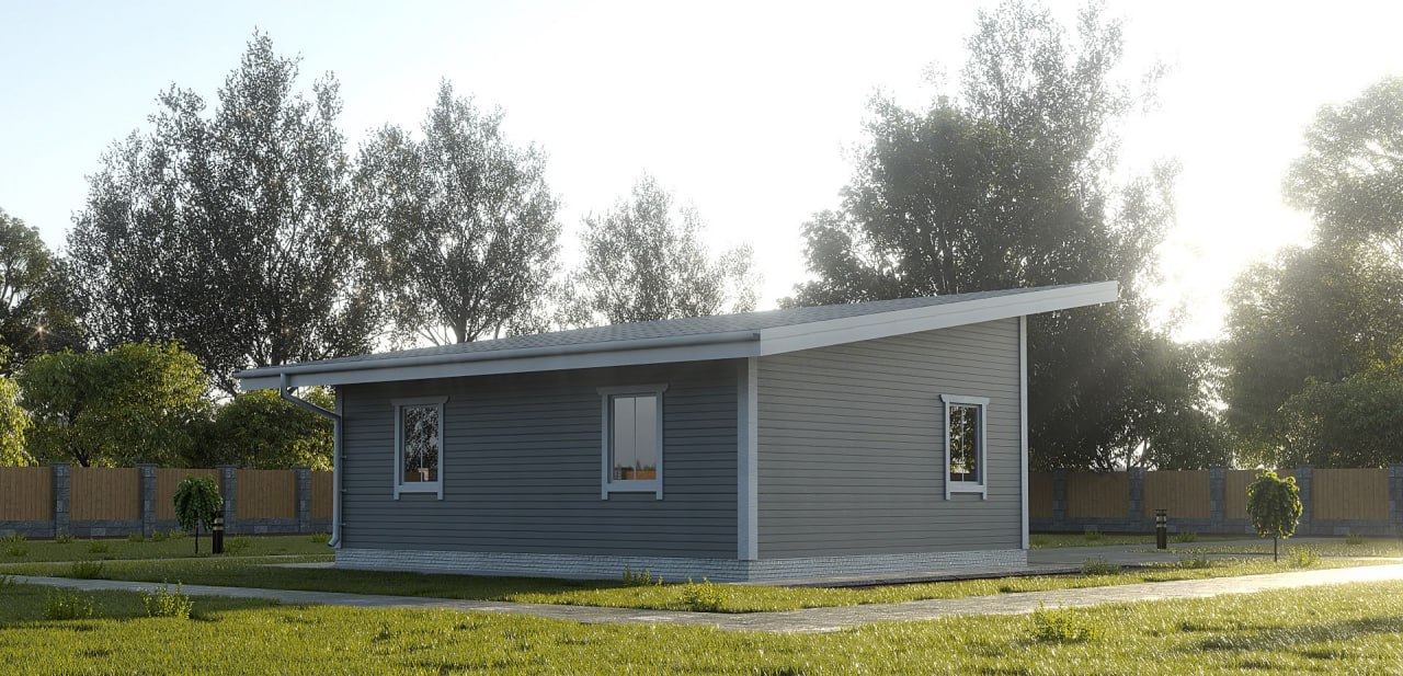 Дом из СИП-панелей, с удобной планировкой: кухня-гостиная, 2 спальни, с/у. Общая площадь дома: 52,4 м2.